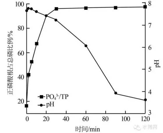 實(shí)驗(yàn)水質(zhì)同2.2,考察臭氧投加質(zhì)量濃度為96mg/L時(shí),廢水中正磷酸鹽占總磷比例和pH隨時(shí)間的變化趨勢(shì),結(jié)果如圖3所示。